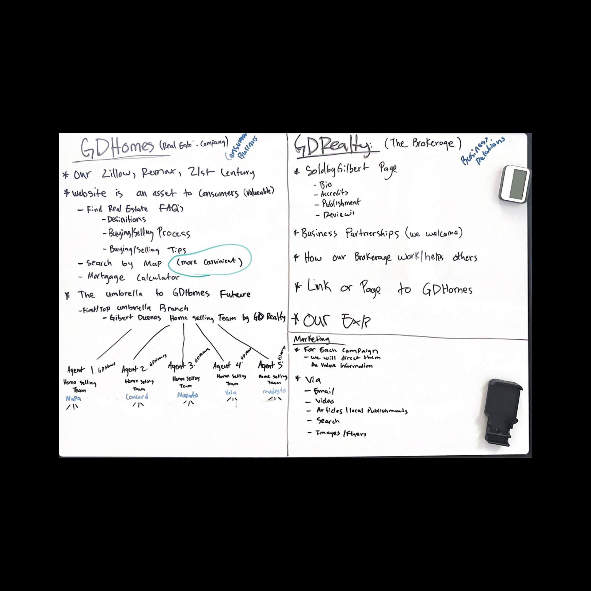 Gilbert Duenas Home Selling Team (now GDHomes), a real estate brokerage startup with a team of three agents aiming to establish a strong social media presence, cohesive brand identity, and a scalable recruitment strategy.